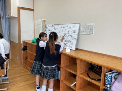 教科係さんや日直さんを中心に後ろのホワイトボードを変えて、みんなに分かりやすいよう伝えてくれています。どの係も責任を持って変えている姿がとても頼もしいです。とっても素敵ですよ!