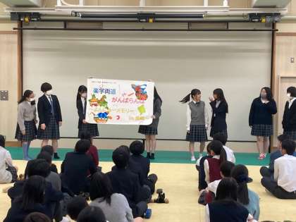 修学旅行に向けて武道場で学年集会を行いました。今回の修学旅行のスローガン「学楽両道 がんばらんば 〜よんにゅうメモリー in長崎〜」をポスターにして作成してくれました。素晴らしい仕上がり具合でした。