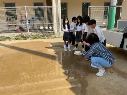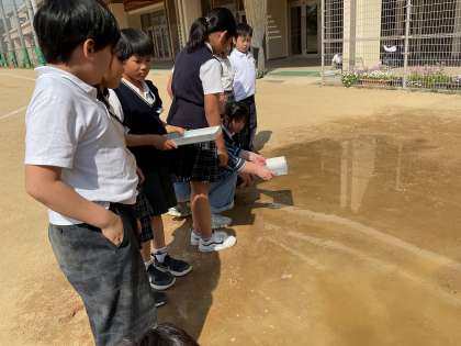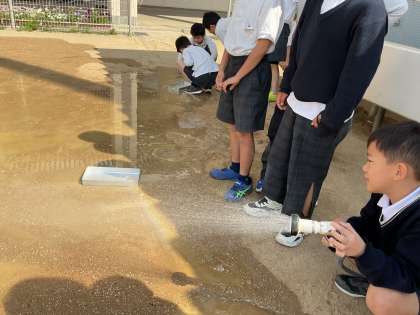 水が流れている地面はどのような形状をしているのか、実際に水を流して実験・観察をしました。
