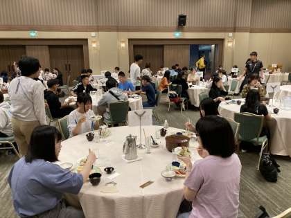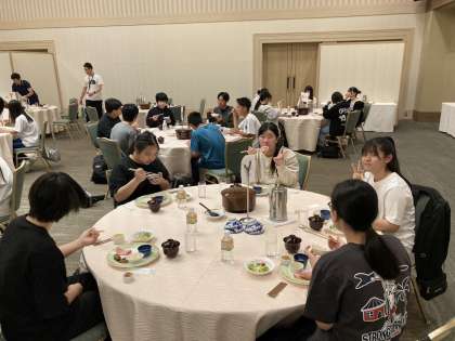 9年生の皆さんは、体調不良等もなく順調に2日目もスタートできています。写真は、朝食の様子です。しっかり食べて今日の活動のためのエネルギーをチャージしましょう!