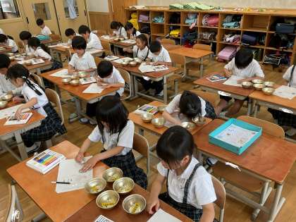 生活の学習でいろいろな種を観察しました。大きさ、形などをよく見て観察しました。「ハートの形がある!」「縞模様がある!」などよく見ないと気が付かないことにも気づいていました。