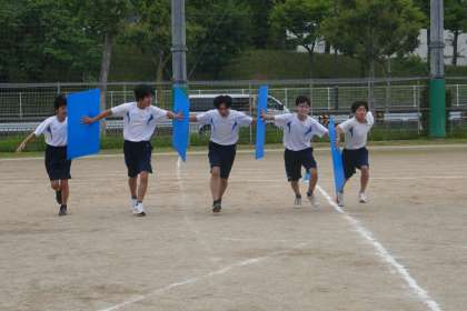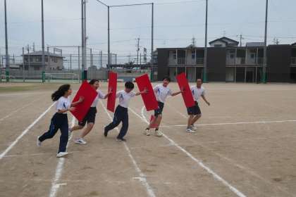 体育の部に向けてステージ種目であるパーテーションリレーに取り組んでいます。各チームで作戦を練りながら楽しく取り組む様子が見られました。