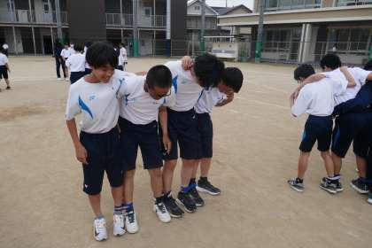 学年種目である4人5脚の練習風景です。掛け声やリズムをそろえようと必死な様子が見られました。本番では息の合った姿を楽しみにしています。