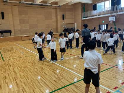 音楽に合わせてペアを作ります。 握手をして色々な人との関わりを持ちました。