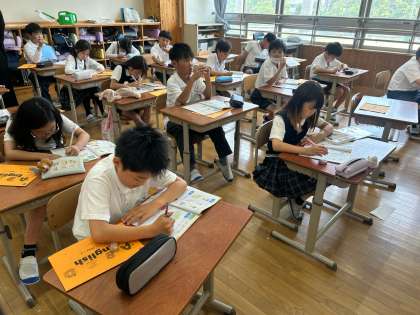 リスニングの問題にも取り組んでいます。 集中して外国語を聞き取ろうとしています。
