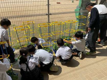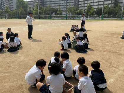 生活の学習で、ほうせんか、ひまわり、マリーゴールド、おじぎそう、ふうせんかずらの種を植えました。どんな花が咲くのか楽しみです。