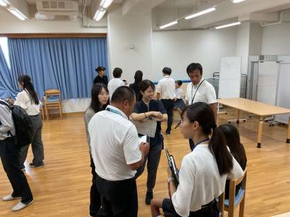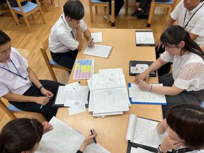 授業を振り返り、協議をしている様子です。よりよい授業づくりのために、話し合っております。教師は常に授業を磨くことが大切です。子どもたちが、深い学びを実践できるように研鑽を積んでいます。