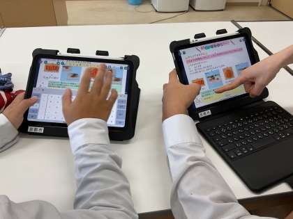 本日、伏見支部のすべての中学校で、伏見支部授業研究会を実施しています。本校では、1組家庭科の授業で実施しました。包丁の使い方を学ぶ授業の様子です。ペアで動画や写真を撮って、お互いの包丁の使い方を確認しています。