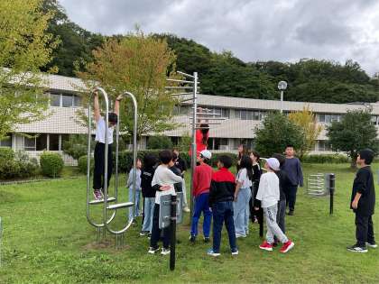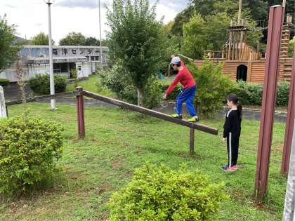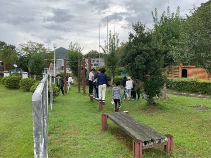 朝食後に芝生広場自由散策時間です。運動遊具がたくさんあるので一つずつチャレンジしていきます。