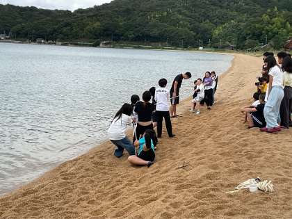 モルックは、チーム戦で戦います。投げるたびに盛り上がっています!綱引きも砂に足をとられながらも、お互いに必死に引っ張って、盛り上がっています!