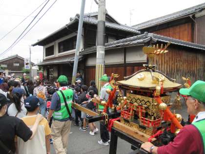 おみこしを観月橋南詰から上林町までの距離を掛け声をかけながら曳き、沿道のかたにも喜んでもらえる様子はとても微笑ましかったです。
