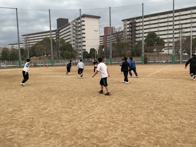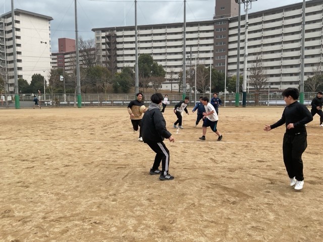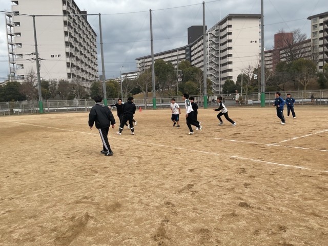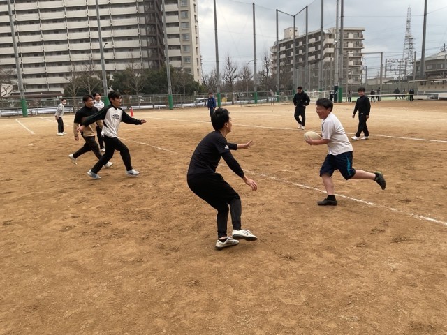 ラグビー部の部活動チャレンジカップの様子です。タックルは危ないので、タッチフットボールで試合を実施しました!スピード感あふれるプレーで果敢にトライを狙う姿がかっこよかったです!ラグビー部は新人戦を終えたところです。次は春の大会です!さらに強いラガーマンに成長していきましょう!