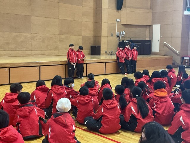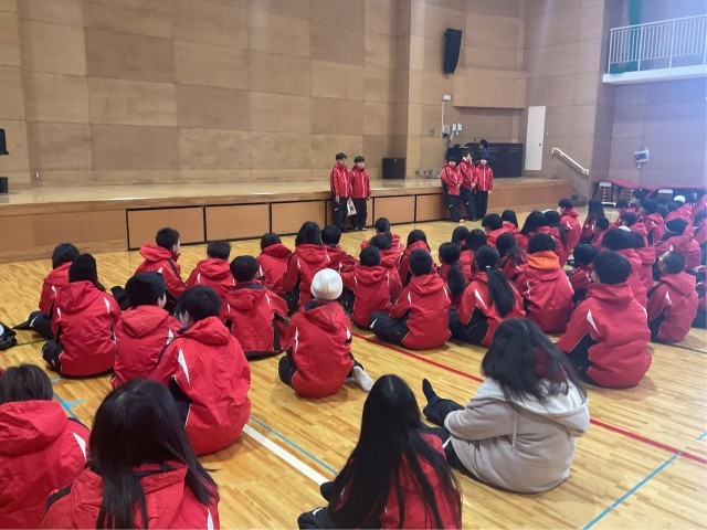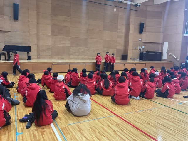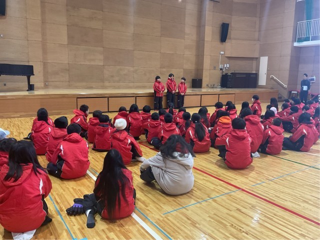 赤いスキーウエアがよく似合います。楽しく過ごすためにルールを守り、挨拶をして協力しようと約束して出発します