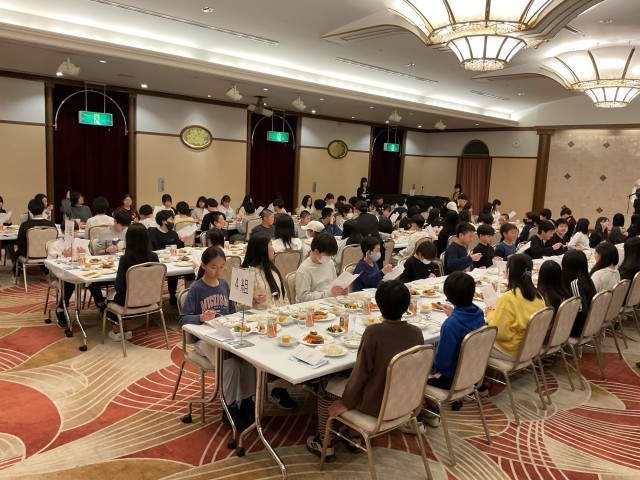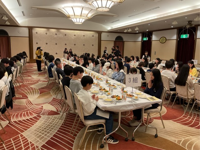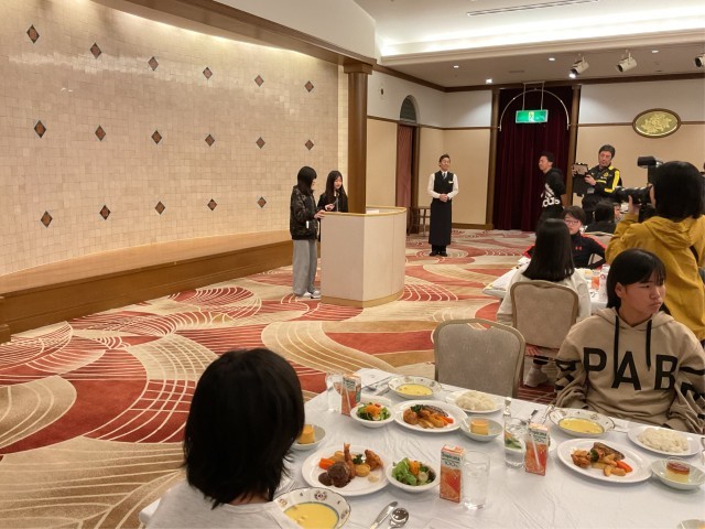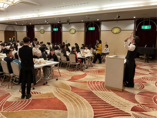 6年生ご一行は、無事ホテルに到着し美味しい夕食を食べています。ホテルの方にテーブルマナーを教えていただき、フォークとナイフで食事をする姿も見られます。
