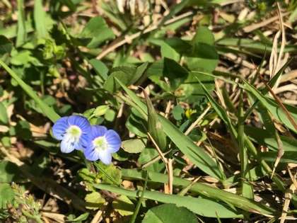 ※「春のうた」に出てくる「いぬのふぐり」は,4月ごろに道ばたにコバルト色の小さな花をつけてさく「おおいぬのふぐり」のことだとされています。下の写真は学校にさいていた「おおいぬのふぐり」です。