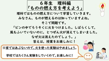 ものはなぜ燃えるのでしょう。なぜ火が消えるのでしょう。考えてみてくださいね。