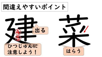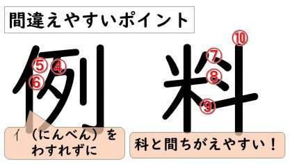 週まつに学習する漢字は4つありますね。例は「にんべん」を忘れないように,料は「科」と間ちがえないように注意しましょう。