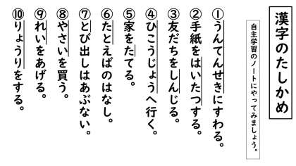 4年生のみなさん,今日は漢字の学習がたくさんありますね。漢字かんぺきくんは,テストの練習ですね。4年生の漢字を8つ学習しましたが,読んだり書いたりすることはできますか。上の10問テストにちょうせんしてみましょう。(自主学習ノートや紙などにしてみましょう。)