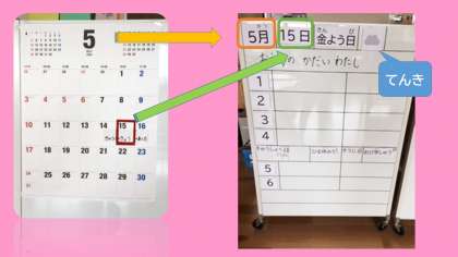 1 カレンダーを みて 〇月 〇日 〇よう日 てんきを はります。