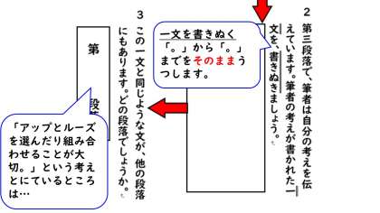今日の学習は,「アップとルーズで伝える2」ですね。教科書に段落番号を書いていきましょう。今回は「白いぼうし」とは違い,行のへこんでいるところに段落の番号を書いていくので気をつけてください。まずは,上の表に書いてある内容をまとめ,そのあと下の問題を解きましょう。