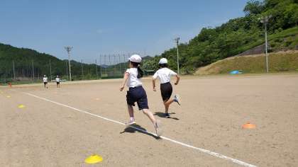 元周山中学のグランドで,50mのタイムを計りました。