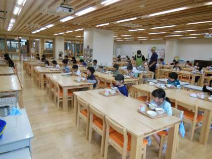 給食では,隣の人と離れていますが,全員が給食を美味しくいただきました。