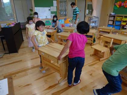 昼休みの後の,掃除が始まりました。3年生が掃除の仕方を教えに来てくれています。ほうきの使い方や,机やいすの運び方を教えてもらって,1年生もがんばっています。