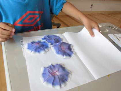 おしべなどを取りのぞいたら,半紙の上にきれいに広げて半紙で挟みます。