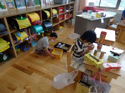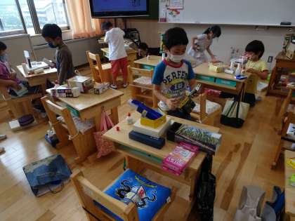 形や大きさのちがう箱を積んだり,並べたりしながら,思い思いの作品を作ることができました。