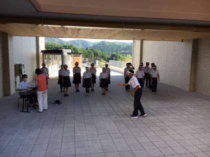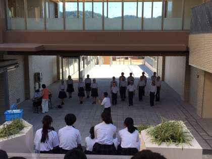 9月8日(火),音楽祭に向けて,8年生はお互いのクラスの合唱を聞き合ってみました。感染予防のため,京都京北小中学校のシンボルともいえる正面の階段で,爽やかな風に吹かれながら,気持ちよく歌いました。歌声に誘われて,1stステージの生徒たちも観客となって,聴いてくれていました。