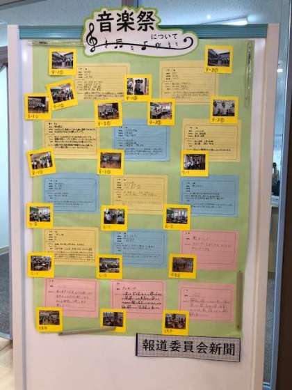 明日はいよいよ音楽祭です。報道委員会では,音楽祭に向けて,各学年,各クラスの発表内容や取組の様子について,壁新聞にまとめました。残念ながら今年は同じ会場で鑑賞することができません。この壁新聞『音楽祭について』で,それぞれの学年やクラスの様子を伝えています。