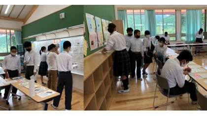 9月10日(木),音楽祭を終えて,5限に『文化祭展示鑑賞』を行いました。1年生から9年生までの展示を楽しみ,途中出合った1年生とのふれあいの様子も微笑ましかったです。9年生の卒論途中経過の展示では,アンケートに答えたり,質問用紙に記入したりしていました。