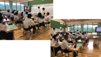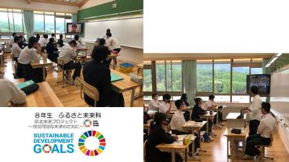 9月30日(水),8年生『ふるさと未来科』。今日は,京都大学大学院地球環境学堂 准教授 浅利先生とzoomでオンライン授業を行いました。生徒たちからは,これまでの授業で考えてきた身の回りのSDGSについて発表しました。浅利先生からは,先生が学生のときから取組んでこられたことや,今大学で教えられていること,そして現在の京北での取組などについてお話いただきました。また,SDGSのことについても,教えていただきました。