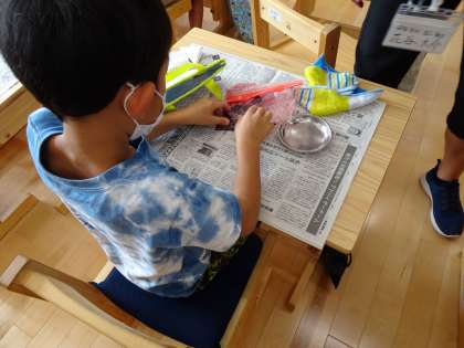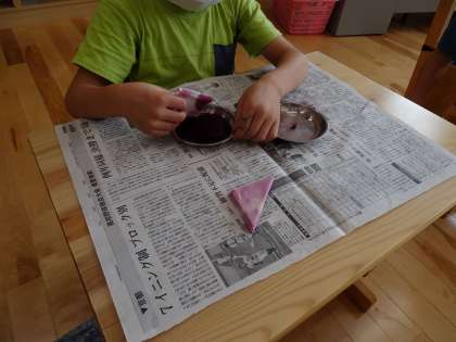 大切に育ててきたアサガオの花で色水遊びをしました。和紙を丁寧に折って染めていきました。和紙を開いてみると,それぞれ違った模様が出てきました。どんなものに使おうか,今から楽しみです。