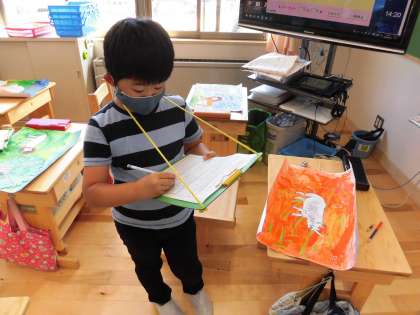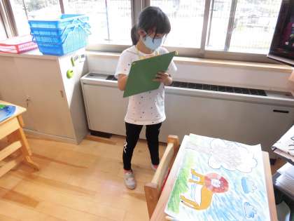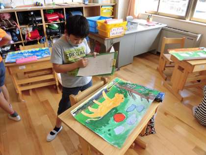 お話の絵が完成しました。色鮮やかで,素敵な作品ばかりです。そして,鑑賞会を行い,友達の作品の良いところや工夫しているところを見つけました。一つとして同じ作品はなく,一人一人の個性を感じながら作品を見る楽しい時間となりました。自分の作品も友達の作品も,全ての作品に良いところがあるということを認識し,鑑賞することができました。