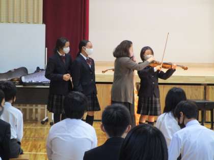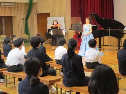 10月23日(金)6・7校時,本校体育館にて「スクールコンサート」が行われ,2ndステージ及び後期3組の生徒が参加しました。当日は「国際芸術文化アカデミー」より4名のプロの演奏家の方々にお越しいただき,本格的な歌,ピアノ,バイオリンを披露していただきました。校歌の演奏や代表生徒によるバイオリン体験もあり,とても楽しい時間を過ごしました。主催者の方からは「きく態度がとても素晴らしい子どもたちですね」「コンサートに適したとてもよく響く体育館ですね」等,お褒めの言葉をいただきました。生徒たちは生の『本物の音楽』に触れ,あらためて音楽の素晴らしさを感じたようでした。