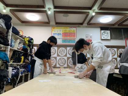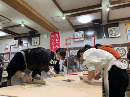 中野うどん学校で、いよいようどん切りです。真ん中の白い線の太さを目標にしながら、みんな真剣!