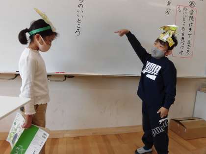 今日は『お手紙』の音読劇をしました。登場人物の気持ちを考えて,工夫して読むことを頑張りました。声に強弱をつけたり,動きをつけたりするなど,かえるくんやがまくんになりきって,音読することができました。また,他のペアのいいところをたくさん見つけ,交流しました。