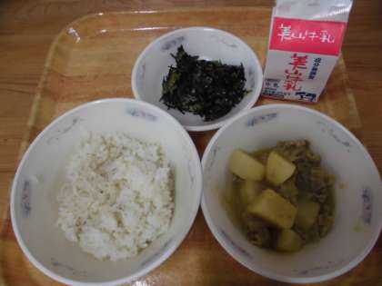 ・今日のきゅう食はにくじゃが(カレー味)でした。わたしはカレーがすきだったので口に合いました。カレーにじゃがいもが入っているから,肉じゃがにもじゃがいもが入っているのだと思いました。とてもおいしかったです。