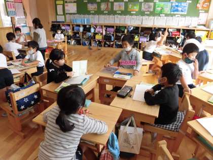 話題を決めて,話し合いを進めていく学習をしています。相手の発言を受けて話をつなげていくことを意識して,どのグループも協力して活動を進めていました。
