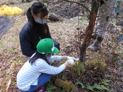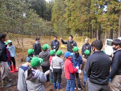 今日のお昼から北桑田高等学校の演習林に行き,植林体験をしました。まず,植林をする流れを高校の先生から聞き,グループごとでの活動がスタートしました。高校生の方に教えていただきながら,植林予定地に生えている木をのこぎりで伐採しました。その後に,穴を掘り,とちの木を植え,獣害防止のネットを設置しました。最後は,使った道具をきれいに洗いました。子どもたちは初めて経験することばかりで,生き生きと活動していました。