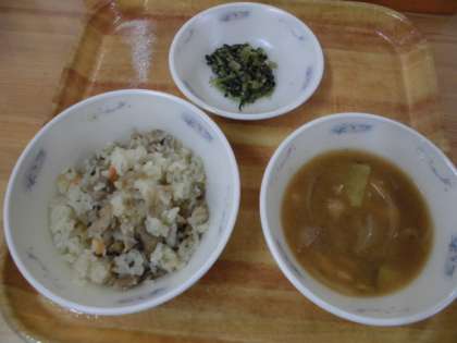 さつまいものみそ汁ととりめしのぐがおいしかったです。さつまいものみそしるはさつまいもがとてもやわらかくて,あまかったです。またたまねぎはやわらかくて,とてもおいしかったです。とりめしのぐはたくさんぐが入っていて,しいたけとごぼうが今どきなので,とてもおいしかったです。私はまた今日のくみあわせの給食を食べたいです。