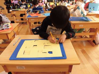 この前の授業でカッターナイフの使い方をマスターしたので,色画用紙に窓を作っていきます。片開きの窓,両開きの窓,曲線が混じった窓,ハート形の窓などがあり,紙を動かしながら上手に切っていました。子どもたちは,最初に比べて随分切るのが上達しています。少し慣れてきた時こそ,怪我をしてしまうことがあります。これからも,安全に気を付けて学習していきます。