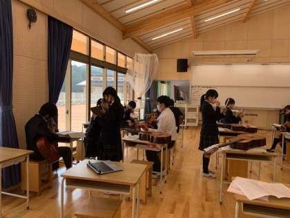 2組は音楽で,ギターに挑戦。大半の人がギターをはじめて弾きます。課題曲をクリアできるように懸命に取り組みました。