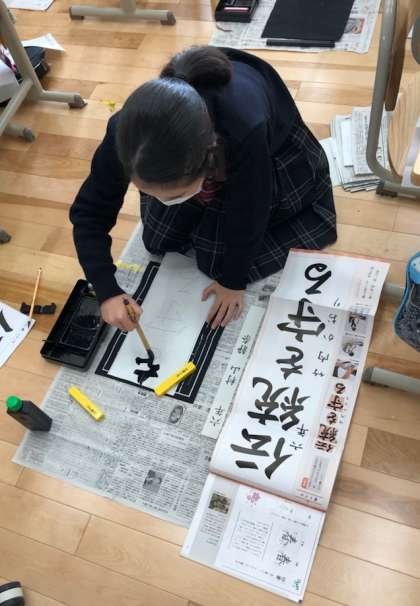 6年生では,書初めの学習をしています。文字の大きさや配列に気を付けて書いています。いつもの半紙とは違うので,特に配列に気を付けて取り組んでいます。