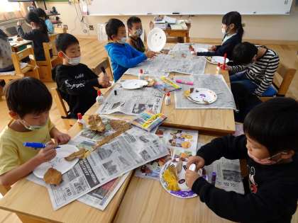 葉っぱや木の実をつかって,かざりづくりに挑戦しました。葉っぱと毛糸を使って「首飾り」を作ったり,紙皿に葉っぱや実をつけてお面を作ったりしました。落ち葉アートに挑戦している子もいました。