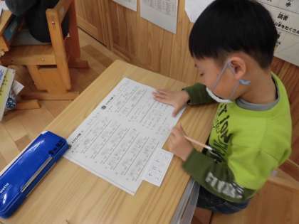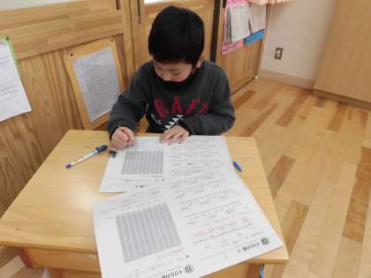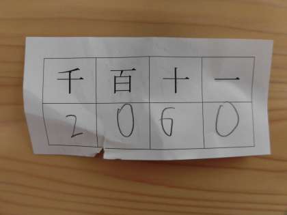 単元の学習が全て終わったので,復習のプリントをしています。例えば,「漢数字の二千六十を数字で表しましょう」という問題では,百の位に「0」を書き忘れて「260」と書いてしまう間違いが多いです。その間違いを防ぐために,位が書かれた表を使って問題を解いています。それによって,位に気を付けて4桁の数を数字で表すことができるようになってきました。今週はテストもありますので,それに向けて自主学習も頑張ってほしいと思います。