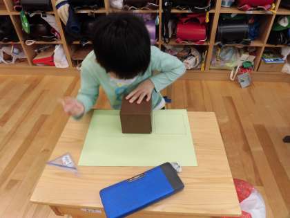 算数科では,『はこの形』を学習しています。実際の箱の面を紙に写し取り,面の数や,長方形と正方形の組み合わせに決まりがあることを学びました。また,辺や頂点の数,辺の長さを意識して,箱作りもしていきます。