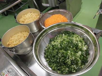 給食では,煮干しでとっただし汁で油揚げやにんじん,青ねぎと一緒に炒り煮にしています。