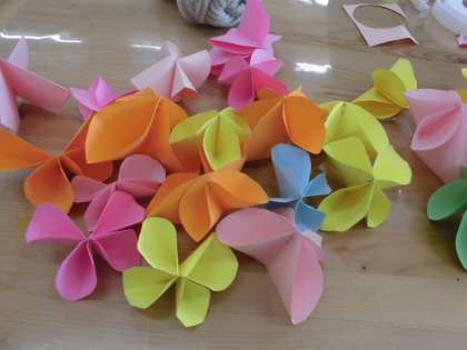 いろいろな進路に向けて飛び立たれる9年生をイメージして,ちょうちょをたくさん作りました。円を描いてハサミで切りホッチキスで留めると出来上がる簡単さなので,子どもたちは,どんどん作成しました。